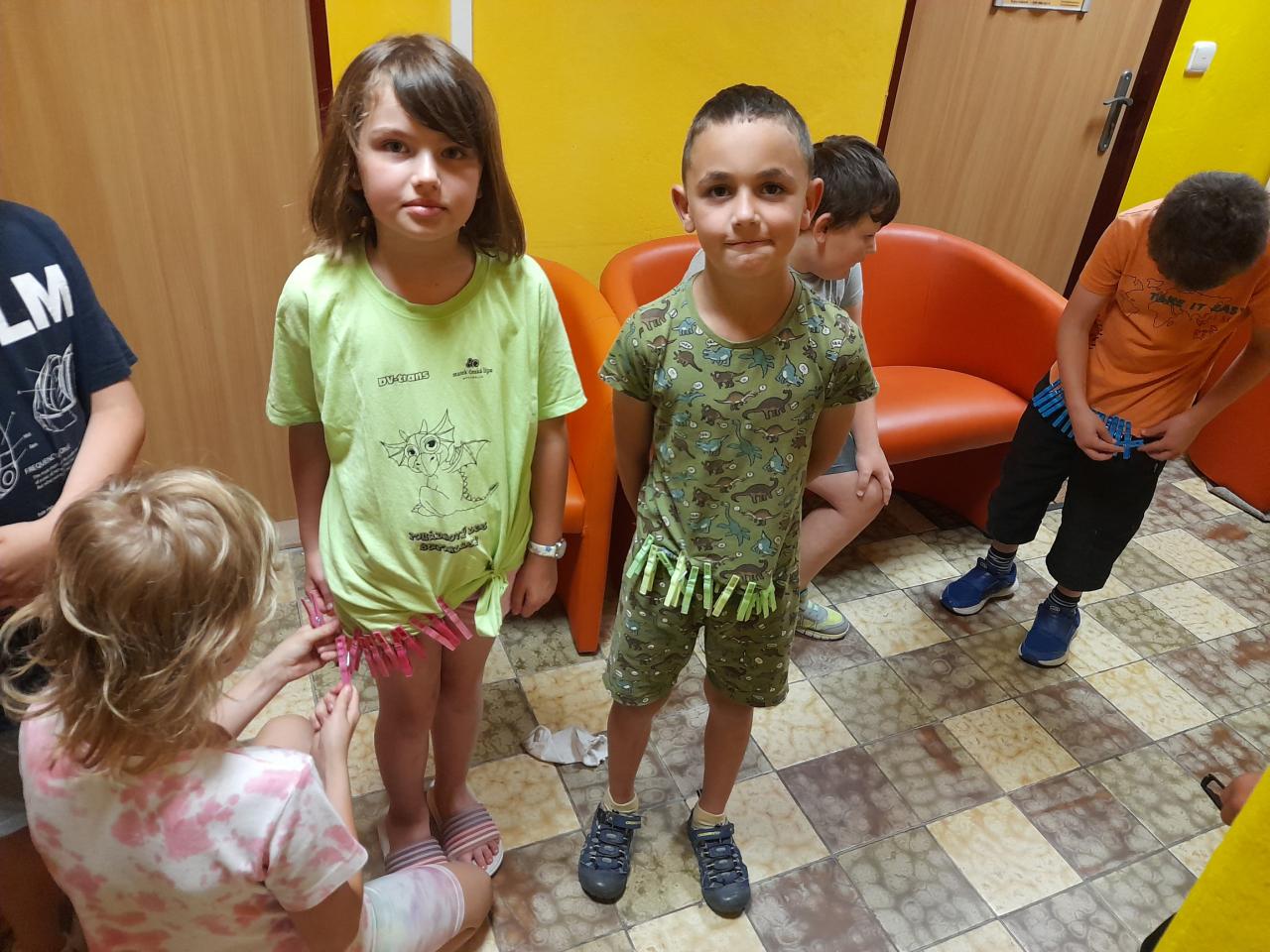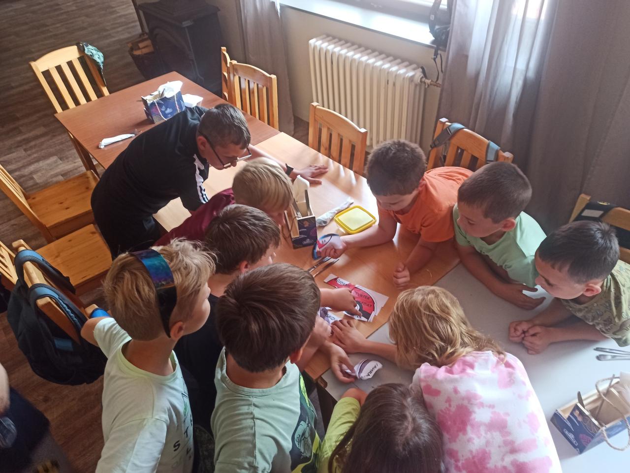 Vymysleli si společně název svého animovaného filmu “Lov Pokémonů” a skvělý akční scénář. Z modelíny a papíru vyrobili hlavní postavy, které ve filmu vystupují. Koordinátorka Simča film sestříhala a mohlo se promítat. Po obědě se děti pustily do venkovních her a další stopovačky. Našli jsme další čtyři díly „pokeballu“ a konečně vyluštili záhadný vzkaz, který nám odhalil, že ve čtvrtek budeme hledat ztracený poklad Pokémonů.