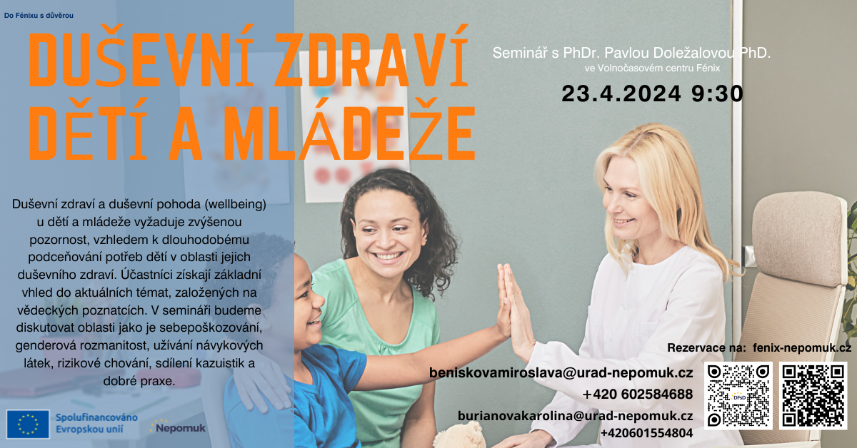Seminář s PhDr. Pavlou Doležalovou PhD., o duševním zdraví a duševní pohodě (wellbeing) u dětí a mládeže. V dnešní době toto téma vyžaduje zvýšenou pozornost, vzhledem k dlouhodobému podceňování potřeb dětí v oblasti jejich duševního zdraví. Účastníci získají základní vhled do aktuálních témat, založených na vědeckých poznatcích. V semináři budeme diskutovat oblasti jako je sebepoškozování, genderová rozmanitost, užívání návykových látek, rizikové chování, sdílení kazuistik a dobré praxe.