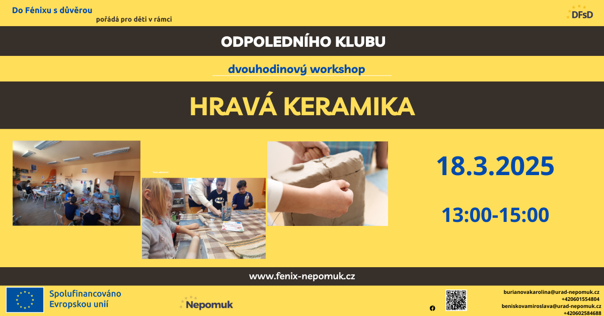 Odpolední klub není jen bezpečným přístavem pro děti ze rodin, které se ocitly ve specifické životní situaci. Je to i místo, kde se tvoří nová přátelství a diskutuje se nad různými tématy. Otevírají se zajímavé rozhovory - vážné i nevážné. Takové, na které není v jiných chvílích nálada, vhodná příležitost nebo chybí ti správní parťáci k tématu. A protože vnímáme tyto diskuze jako velmi důležité, snažíme se dětem v klubu nabízet příjemné prostředí a různé aktivity, při kterých si přirozeně a nenuceně povídáme. Tak se mohou děti Odpoledního klubu Do Fénixu s důvěrou těšit na Hravou keramiku, kterou jim dopřejeme 18.3.2025 od 13:00 o 15:00 v keramické dílně Volnočasového centra Fénix.