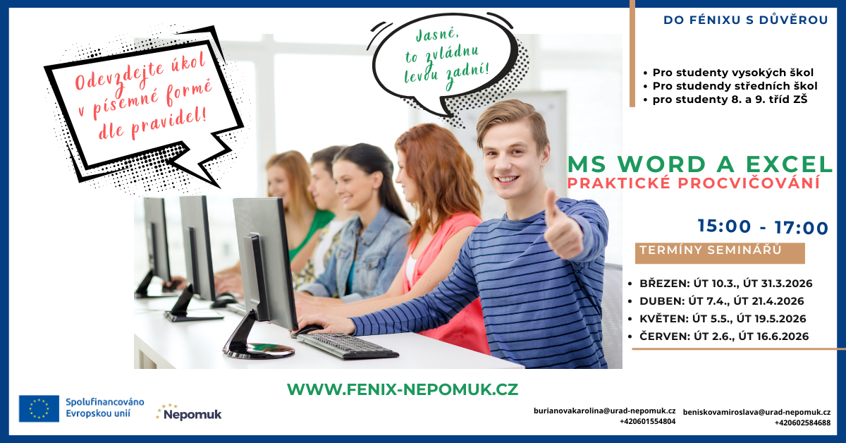 Tak se přihlaš na naše semináře, uvidíš, jak ti skutečná znalost těchto programů usnadní studentský život - referáty, seminárky a ročníkové práce se budou tvořit o mnoho snáze! Budeme mít prostor k individuálním dotazům a také budeme tvořit a pracovat na dokumentech, které vás aktuálně nejvíce „trápí“.