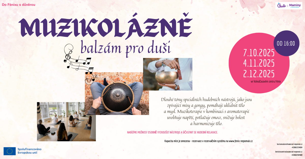 Kromě hudební relaxace si budete moci i jednotlivé hudební nástroje vyzkoušet. Začínáme 7.10. 2025 v 16:00 ve Volnočasovém centru Fénix, kapacita míst je omezená - je nutné se přihlásit přes rezervační systém projektu Fénix pro rodiny a děti, který tuto akci pořádá. Odkaz zde: /do-fenixu-s-duverou/rezervacni-system/