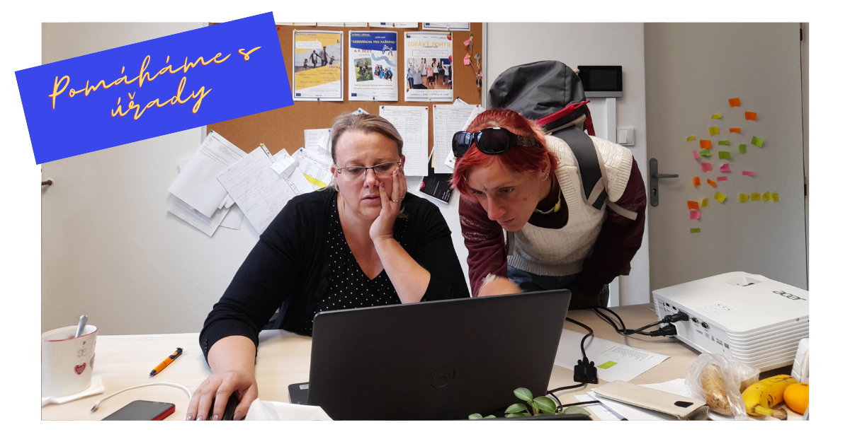 Na fotografii zachycena paní, která přišla o osobní věci s garantkou projektu, která sedí u PC.