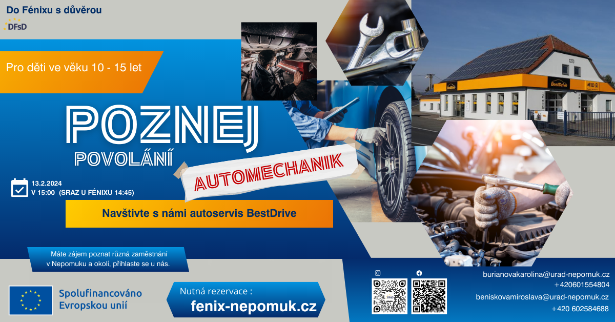 Dne 13.2.2024 se v 15:00 chystáme do autoservisu BestDrive v Nepomuku, kde nám místní automechanici řeknou, co vše je zapotřebí vystudovat, naučit se a umět pro vykonávání tohoto povolání. Je to již čtvrtá ukázka v rámci akce Poznej povolání v projektu Do Fénixu s důvěrou. Děti ve věku 10-15 let si zkoušejí různá povolání v době, kdy se rozhodují o tom, co v životě chtějí dělat. Případní zájemci se mohou registrovat v rezervačním systému: do-fenixu-s-duverou/rezervacni-system/