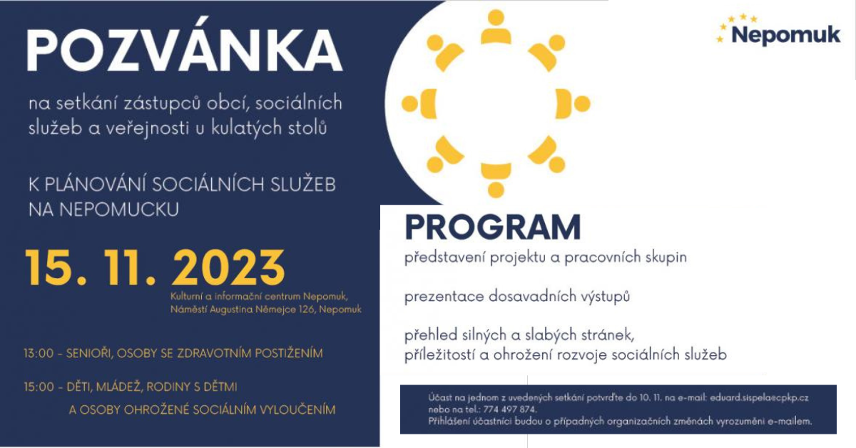 Plánování sociálních služeb na Nepomucku 15.11.2023. Kulturní a informační centrum Nepomuk, náměstí Augustina Němejce 123, Nepomuk.