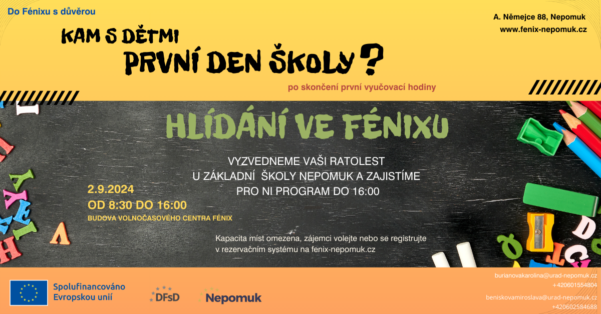 Vyzvedneme Vaši ratolest 2.9.2024 v 9:00 u Základní školy v Nepomuku a zajistíme pro ni program do 16:00 v prostorách Volnočasového centra Fénix. Kapacita míst je omezena, proto využijte náš rezervační systém na stránkách projektu Do Fénixu s důvěrou www.fenix-nepomuk.cz.