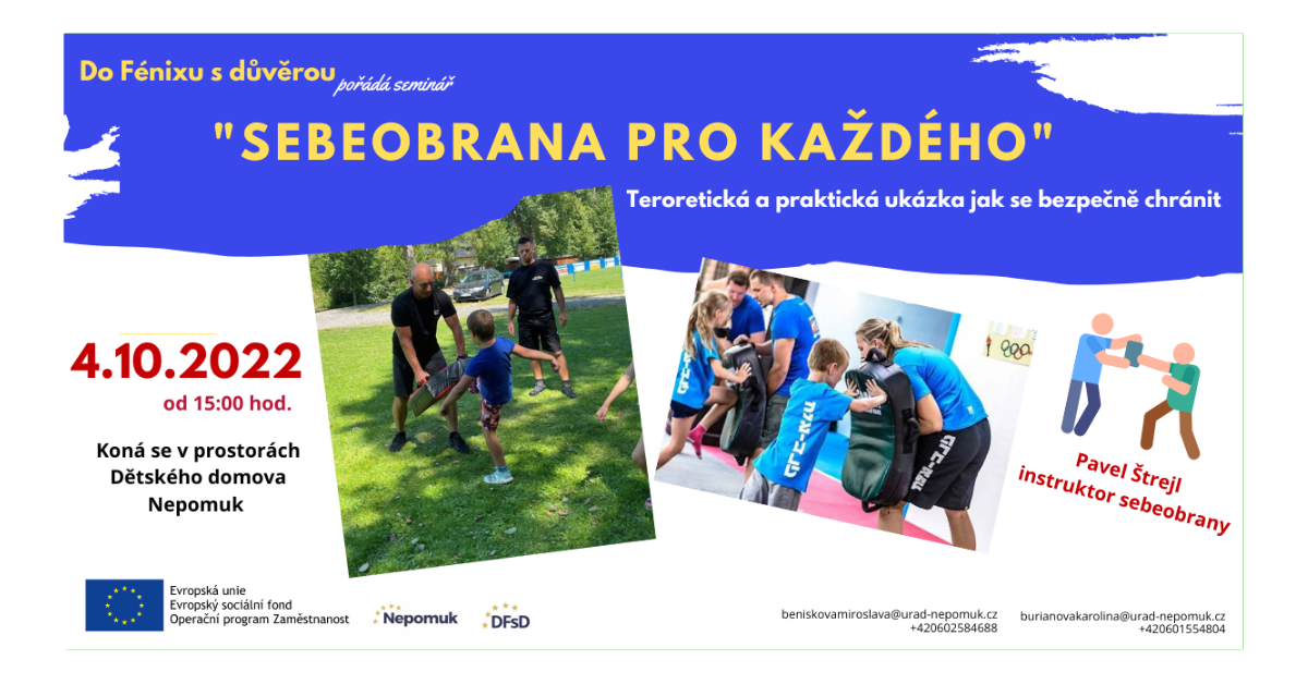 Mít možnost se bránit a vědět jak na to, přitom těchto znalostí nezneužívat. To dětem z Dětského domova v Nepomuku vysvětlí instruktor sebeobrany Bc. Pavel Štrejl v úterý 4.10.2022 od 15:00. Bude zaměřeno na teoretickou a praktickou ukázku, jak se bezpečně chránit.