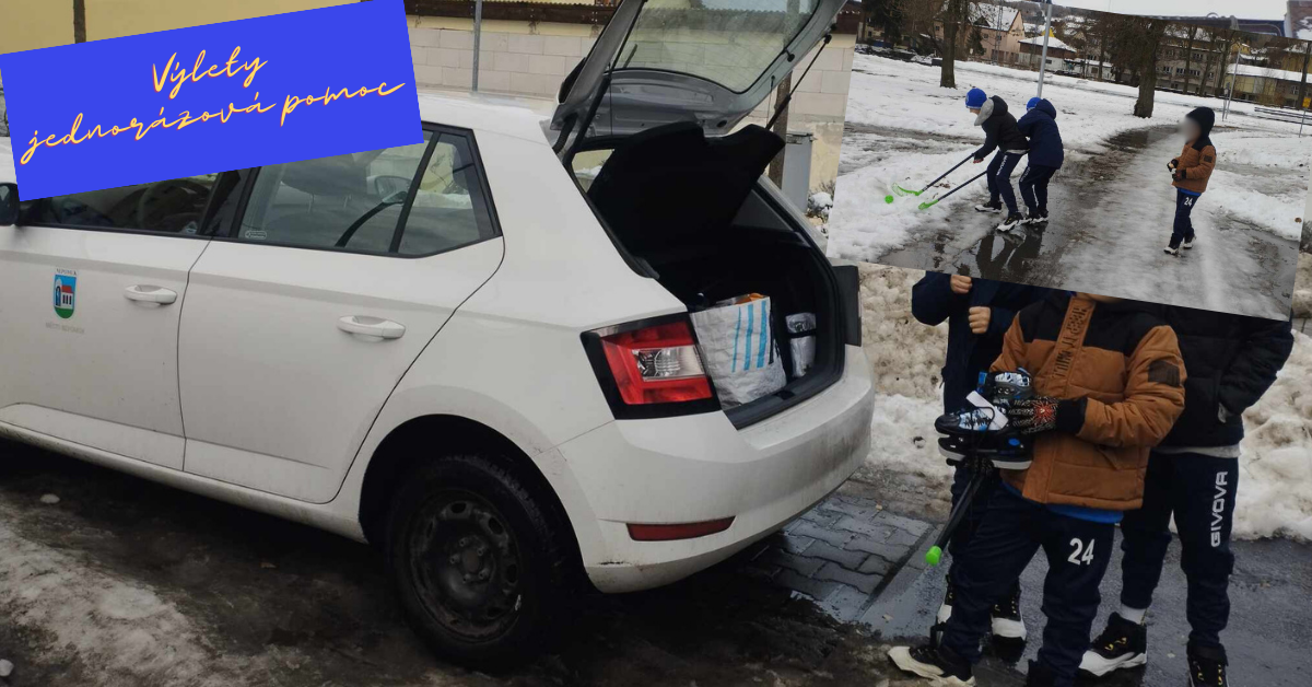 Na fotografii zobrazeno osobní auto a děti při přípravě na bruslení.